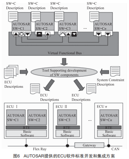 AUTosAR作為汽車行業(yè)主流開發(fā)平臺,為ECU軟件開發(fā)提供了標準的開發(fā)和集成方案(圖6),基于該方案AUTosAR定義了ECU軟件標準架構(gòu),其中包括系統(tǒng)服務(wù)、通信服務(wù)、內(nèi)存服務(wù)、硬件抽象、MCAL等標準ECU基礎(chǔ)軟件,使得ECU的開發(fā)效率大大提高,并增加了ECU軟件集成的靈活性。目前,全球各大汽車制造商都已開始要求采用AUTosAR進行汽車電子產(chǎn)品的開發(fā)。