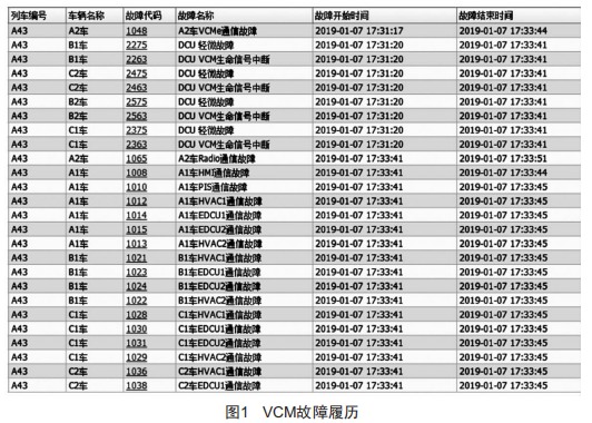 讀取列車(chē)故障履歷、事件記錄儀數(shù)據(jù),故障時(shí)刻VCM故障記錄顯示07043044車(chē)"A2車(chē)VCMe通信故障""DCUVCM生命信號(hào)中斷"、整車(chē)主門(mén)控器"EDCU通信故障""HMI通信故障"等列車(chē)子設(shè)備通信故障,如圖1所示。