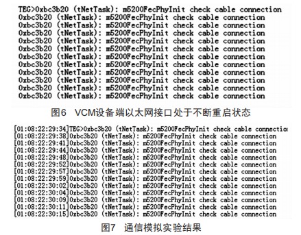 為了驗(yàn)證是否是以太網(wǎng)通信數(shù)據(jù)異常導(dǎo)致MVB通信故障,進(jìn)行了下面的模擬實(shí)驗(yàn):使用ostinato軟件模擬廣播數(shù)據(jù)幀,直接將網(wǎng)線連接到VCM模塊上,同時(shí)對(duì)兩端的VCM模擬大量數(shù)據(jù)通信。流量最大時(shí)設(shè)置為5萬(wàn)包/s,持續(xù)時(shí)間最長(zhǎng)20min。期間出現(xiàn)大量打印信息"0xbc3b20(tNetTask):m5200FecPhyInitcheckcab1econnection",如圖7所示。