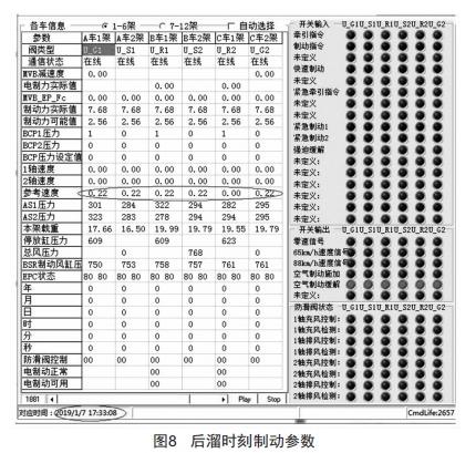 讀取后溜時(shí)刻制動(dòng)數(shù)據(jù),如圖8所示,在17:33:02時(shí)牽引指令線失電,17:33:10時(shí)施加快速制動(dòng)。在此期間,車(chē)輛在前5s處于惰行至停車(chē),后3s處于后溜,后溜時(shí)產(chǎn)生約0.22km/h的速度。