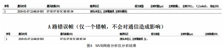 用MVB網(wǎng)絡(luò)協(xié)議分析儀采集此時(shí)的MVB總線數(shù)據(jù)如圖4所示,可以看出故障時(shí)刻兩路MVB通道均只有1個(gè)錯(cuò)誤幀,此時(shí)MVB總線狀態(tài)正常。因此網(wǎng)路總線受到干擾的原因可排除。