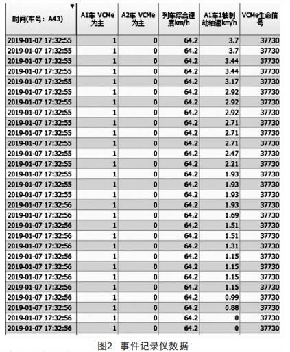 讀取事件記錄儀數(shù)據(jù),根據(jù)A1車(chē)1軸制動(dòng)軸速,判斷在17:32:56之前列車(chē)處于減速過(guò)程,直至列車(chē)速度至0,由于網(wǎng)絡(luò)卡死,列車(chē)的綜合速度一直處于故障時(shí)的列車(chē)速度64.2km/h,如圖2所示。