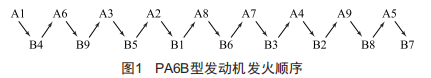 18PA6B型備用柴油機(jī)共包括18個(gè)氣缸 ,分兩列布置 ,則單列氣缸間的發(fā)火間隔角o單=720A/9=80A(CA) 。此外 ,該型柴油機(jī)的V型角度為60A ,排間發(fā)火間隔角度o排=420A(CA) ,發(fā)火順序如圖1所示。