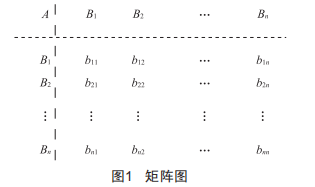 對同層次的指標(biāo),通過兩兩對比的方式建立判斷矩陣。假定A層中元素A與下一層次中元素Bl,B2,B3,…,Bn有聯(lián)系,如圖1所示。