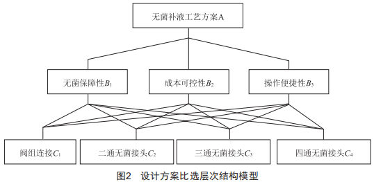 首先,在無菌補(bǔ)料工藝設(shè)計方案比選中,將選擇最優(yōu)的無菌補(bǔ)料工藝設(shè)計方案作為目標(biāo),處于高層目標(biāo)層的位置。其次,在設(shè)計方案比選過程中,無菌保障性、操作便捷性及成本可控性是三個最主要的考量因素,因此將這三個因素建立為準(zhǔn)則層。再次,將各備選方案建立為措施層。最后,將層次結(jié)構(gòu)模型設(shè)置成三層,如圖2所示。