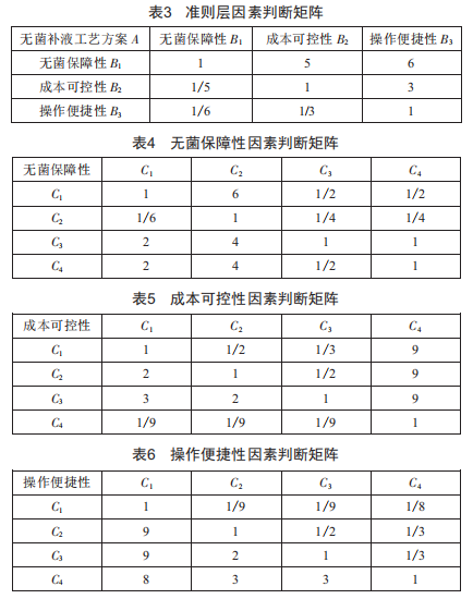 其次,以在建的H疫苗項目無菌補(bǔ)料工藝設(shè)計為例進(jìn)行AHP法的實際運(yùn)用研究。針對滿足GMP要求及無菌補(bǔ)料工藝設(shè)計要求的多個備選方案,分別從影響方案選擇的重點(diǎn)因素進(jìn)行風(fēng)險分析,確定各備選設(shè)計方案優(yōu)劣狀況。采用AHP法對各設(shè)計方案進(jìn)行逐一比較,確定適合本項目的最佳方案。