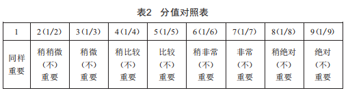 對各指標(biāo)之間進(jìn)行兩兩對比之后,按9分位比率排定各評價指標(biāo)的相對優(yōu)劣順序,依次構(gòu)造出評價指標(biāo)的判斷矩陣。9分位比率分值對照表如表2所示。