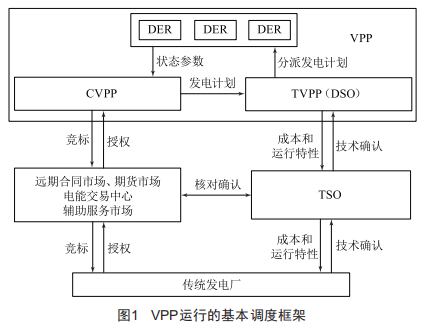 圖2具體說(shuō)明了CVpp運(yùn)行的大致流程。對(duì)于電力市場(chǎng)而言,虛擬電廠所代表的是一個(gè)電源聯(lián)合體,虛擬電廠的發(fā)電容量即為所有分布式電源的總?cè)萘?這樣就消除了單一電源并網(wǎng)參與電力市場(chǎng)時(shí)所面臨的容量限制,使得小容量、分散的分布式電源也取得了市場(chǎng)獲益的機(jī)會(huì),更有利于分布式電源的經(jīng)濟(jì)運(yùn)行和發(fā)展。CVpp代表各不同容量、不同特點(diǎn)的分布式電源加入電力市場(chǎng)后,CVpp將根據(jù)電力市場(chǎng)的信息(如電價(jià)、合約要求等)制定經(jīng)濟(jì)最優(yōu)發(fā)電計(jì)劃和市場(chǎng)競(jìng)標(biāo)方案。CVpp將分布式能源(DistributedEnergyResources,DER)聚合后的容量和特性類(lèi)似于傳統(tǒng)的小型發(fā)電廠,因此虛擬電廠將同傳統(tǒng)發(fā)電廠一起參與市場(chǎng)競(jìng)標(biāo)。