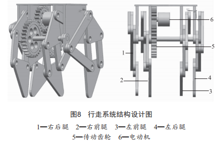 行走轉(zhuǎn)系是機器人教具完成物料搬運的關(guān)鍵部分,也是機器人其他轉(zhuǎn)系的安裝平臺,其性能優(yōu)劣直接影響到機器人運動的平穩(wěn)性和物料搬運的效率。本文統(tǒng)要采用多連桿復(fù)合機構(gòu)進行四足仿生設(shè)計(圖8),模擬四足動物的行走方法,進一步為學(xué)生展現(xiàn)多連桿機構(gòu)復(fù)雜運動的特點,使學(xué)生掌握構(gòu)件數(shù)量、高副、低副與自由度的關(guān)轉(zhuǎn),明確多連桿機構(gòu)具有確定相對運動的條件。
