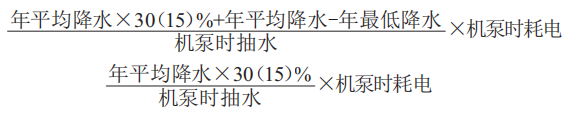 計算排灌電耗時,還有一個重要的影響因素,即非正常降水。當遇上影響降水的自然災(zāi)害時,排灌電耗就會隨之增高。因此,在計算時應(yīng)加入變化系數(shù)。該系數(shù)由所遇自然災(zāi)害的種類及其嚴重性來確定,同時也受排灌區(qū)的地勢、地貌及水利設(shè)施影響。結(jié)合實際情況,給出了降水增加和降水減少兩種情況下增耗電能的計算公式: