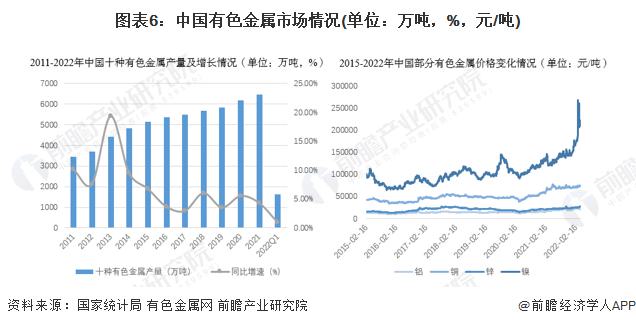 其次是有色金屬市場(chǎng),2011-2021年,我國(guó)十種有色金屬產(chǎn)量持續(xù)增長(zhǎng),2019-2021年兩年平均增長(zhǎng)5.1%。其中,精煉銅產(chǎn)量1048.7萬(wàn)噸,增長(zhǎng)7.4%,兩年平均增長(zhǎng)3.5%;原鋁產(chǎn)量3850.3萬(wàn)噸,增長(zhǎng)4.8%,兩年平均增長(zhǎng)4.8%;從價(jià)格上看,進(jìn)入2022年后,我國(guó)的有色金屬價(jià)格均有不同程度的上漲。
