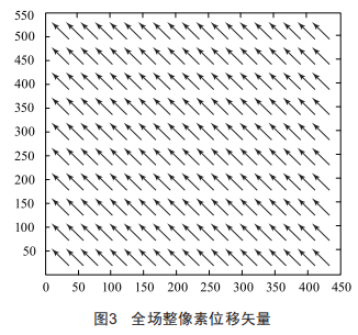 為提高算法的可靠性和靈活性,本文采用了自適應(yīng)閾值選取的方法,有效降低圖像噪聲和局部曝光對(duì)算法產(chǎn)生的影響。圖像相關(guān)匹配通常需要對(duì)整個(gè)位移前后的散斑圖像所有像素進(jìn)行遍歷相關(guān)運(yùn)算,從而確定物體位移前后全場(chǎng)像素點(diǎn)的位移矢量(圖3)。相鄰兩個(gè)匹配點(diǎn)的參考子區(qū)和搜索區(qū)域都會(huì)存在重疊區(qū)域,相鄰兩個(gè)匹配點(diǎn)搜索區(qū)域的紋理信息以及受到的噪聲和曝光影響相似,因此可認(rèn)為其相關(guān)系數(shù)分布存在一定的相似性。本文基于這一特征,統(tǒng)計(jì)當(dāng)前匹配點(diǎn)在局部匹配模板下相關(guān)系數(shù)的分布,從而得到各個(gè)區(qū)間內(nèi)相關(guān)系數(shù)值的數(shù)量,通過(guò)計(jì)算確定合適的相關(guān)系數(shù)值作為下一匹配點(diǎn)的閾值。