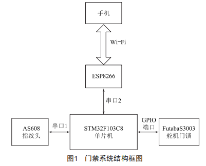 該門禁系統(tǒng)以單片機為核心,通過串口與指紋傳感器連接實現雙向通信,獲取指紋數據;通過Wi-Fi模塊利用手機App維護指紋庫;單片機通過GPIo接口產生PeM信號控制舵機運動開鎖;單片機通過Wi-Fi模塊與手機實現雙向通信。電源部分電路則對板上所有系統(tǒng)進行供電。