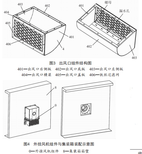 如圖3所示,出風(fēng)口右側(cè)板、出風(fēng)口底板、出風(fēng)口左側(cè)板及出風(fēng)口橫梁焊接形成出風(fēng)口支架:出風(fēng)口底板上有漏水孔:出風(fēng)口蓋板和鐵絲過濾網(wǎng)焊接成出風(fēng)口蓋板組件:將出風(fēng)口蓋板組件安裝在出風(fēng)口支架上,形成出風(fēng)口組件。如圖4所示,最后將外掛風(fēng)機組件安裝在集裝箱的外墻壁上,風(fēng)機線穿過風(fēng)機組件后進入集裝箱體內(nèi)。