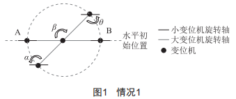 主軸旋轉(zhuǎn)有兩個(gè)方向 ,情況1:順時(shí)針方向旋轉(zhuǎn)8角度 ,那么A、B軸的旋轉(zhuǎn)方向?yàn)橹鬏S指向現(xiàn)有水平方向 ,大小為a、θ ,如圖1所示。