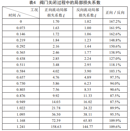 從圖13可以看出,在0~0.438s內,閥門開度大于45°時,閥門的局部損失系數變化平緩,說明此時閥門的流量特性是較為穩(wěn)定的:在0.438s之后,隨著時間的推移,閥門開度逐漸減小,此時閥門的流動阻力系數呈指數上升趨勢,小開度時閥門的流量特性較差。