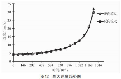 在0~0.876S內,速度的階躍不是很大,對閥門的沖擊較小;在0.876S之后,隨著閥門開度逐漸變小,速度的階躍以指數增長,達到來流速度的5倍乃至10多倍(圖12),對于閥門的可靠運行存在很大的隱患。