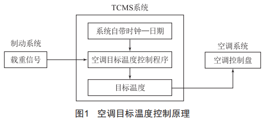 智能控制空調(diào)目標(biāo)溫度原理:列車轉(zhuǎn)向架二系空氣彈簧通過均壓閥產(chǎn)生載重空氣信號,車重空氣信號用來控制EPAC2智能閥中的中繼閥,在實(shí)現(xiàn)制動(dòng)調(diào)整功能的同時(shí),通過EPAC2智能閥和TCMS系統(tǒng)的接口將列車載重信號上傳發(fā)送至TCMS系統(tǒng),TCMS系統(tǒng)中空調(diào)目標(biāo)溫度控制程序接收來自制動(dòng)系統(tǒng)的載重信號和TCMS系統(tǒng)自帶的時(shí)鐘日期,根據(jù)邏輯判斷生成目標(biāo)溫度,通過TCMS系統(tǒng)和空調(diào)系統(tǒng)的接口發(fā)送至空調(diào)控制盤,空調(diào)系統(tǒng)根據(jù)指定的目標(biāo)溫度進(jìn)行控制,如圖1所示。