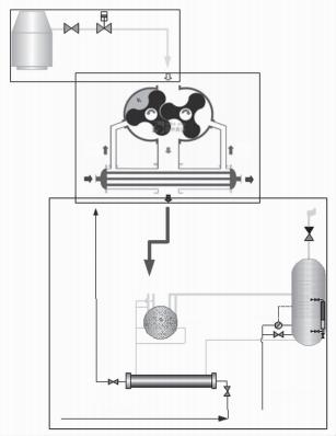 整套羅茨-水環(huán)真空泵組工藝流程為:來自汽輪機凝汽器的蒸汽和不凝結(jié)氣體進入羅茨真空泵,加壓后經(jīng)冷卻器冷凝部分回流羅茨泵,其他不凝結(jié)氣體和少量蒸汽進入下級小功率水環(huán)真空泵,經(jīng)水環(huán)真空泵后排入汽水分離罐。由于提高了小功率水環(huán)泵的入口壓力,同時進入水環(huán)泵的蒸汽量也大幅減少,可保證小功率水環(huán)泵高效穩(wěn)定運行。