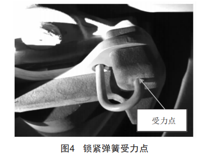 該車運營公里數(shù)已達144萬公里,在此期間的維護是對鎖緊彈簧進行外觀檢查。分析生銹的原因為有水滲入鑄件孔,而廣州3號線制動閘片磨耗小、更換周期長,使得鎖緊彈簧保持在同一個位置幾年不變,隨著時間的增加銹蝕更加嚴重,導致鎖緊彈簧被銹死在鑄件中。又鎖緊彈簧受力點恰巧在剛好露出鑄件的邊緣,如圖4所示,鎖緊彈簧被銹死在鑄件中,使受力點承受了更大的力,導致列車運行一段時間后鎖緊彈簧斷裂。