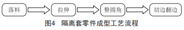 另外,從零件結(jié)構(gòu)可以看出,隔離套凸緣帶翻邊,因而成型過程中要增加翻邊工序??紤]到前期拉伸毛坯的落料工序和后期邊緣毛刺的切邊工序,隔離套零件的成型工藝流程如圖4所示。