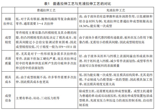 板料充液拉伸工藝為新型的拉伸工藝,是一種柔性的成型方式。充液拉伸工藝采用液體介質(zhì)作為傳力介質(zhì)傳遞載荷,使板料在液體介質(zhì)的壓力作用下緊靠凸模以實(shí)現(xiàn)零件的成型。與普通拉伸工藝相比,先進(jìn)的充液拉伸工藝具有許多優(yōu)點(diǎn),如表1所示。