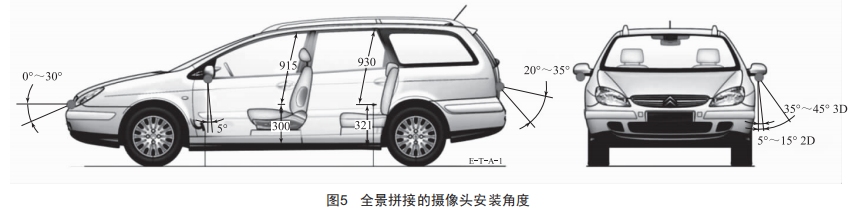 在3D的系統(tǒng)中,左右攝不但需要考慮能拍攝到有一定高度的周邊物體,同時(shí)也需兼顧擺放在車四周的標(biāo)定布的完整攝取,對(duì)攝像頭的要求更高,所以3D攝像頭比2D的要求更高,水平和垂直視場(chǎng)角要求更大,能攝取更廣闊角度的圖像。在對(duì)選用角度進(jìn)行測(cè)試時(shí),用一組水平1859、垂直1249的高清攝像頭測(cè)試,外傾角度小于459時(shí),勉強(qiáng)可完整攝取到靠在車邊的標(biāo)定布,取得合格的標(biāo)定結(jié)果。角度更小當(dāng)然對(duì)標(biāo)定更有利,可是這樣就降低了對(duì)周邊物體的攝取高度,為了平衡兩方面的需要,取359~459是合理的選擇。
