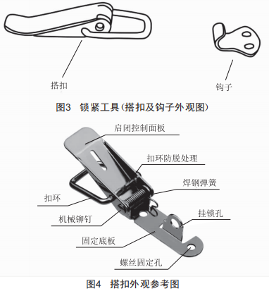 (2)帶有鎖緊工具的護(hù)管:它與"幾"字形金屬搖把前端固定。護(hù)管2一半通過螺絲固定孔連接鎖扣(圖3),一半通過螺絲固定孔連接鉤子(圖3),然后操作啟閉控制面板(圖4)使護(hù)管兩半夾緊。