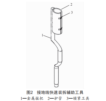 本文所述接地線快速裝拆輔助工具(圖2)由兩部分組成,分別是帶有鎖緊工具3的護(hù)管2和"幾"字形金屬搖把1。