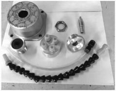 制定設(shè)計方案,用CAD軟件畫出立體圖和工程圖,制作該作品,使用加工中心機床、數(shù)控車床、普通車床、鉆床來加工所需的零件,購買必要的標(biāo)準(zhǔn)件。主要加工件和采購件如圖2所示。通過鉗工裝配完成冷卻液噴頭組合器,經(jīng)過安裝在數(shù)控車床上測試,該冷卻器冷卻準(zhǔn)確、調(diào)整方便,測試結(jié)果令人相當(dāng)滿意。