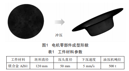 圖1展示了某電機(jī)整體裝配零部件沖壓成型工藝過(guò)程,存在相對(duì)復(fù)雜的壓邊力,有相應(yīng)研究?jī)r(jià)值及拉伸難度,本文以此零件進(jìn)行CAE成型分析與說(shuō)明,工件材料參數(shù)如表1所示。