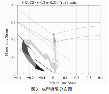 CAE分析結(jié)果如圖2、圖3所示,其中,圖2是成型形貌分布,可以直觀地看出裂紋可能的發(fā)展位置與趨勢(shì):圖3是成型極限的數(shù)值分布,可以顯示出具體的成型不良區(qū)域的數(shù)值大小。