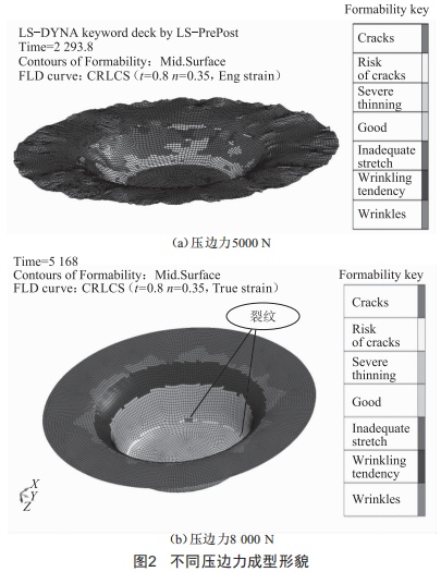 壓邊力過(guò)小時(shí),由于成型件反作用力大,壓邊力無(wú)法克服成型件反力,翹曲起皺為限制成型的主要因素。