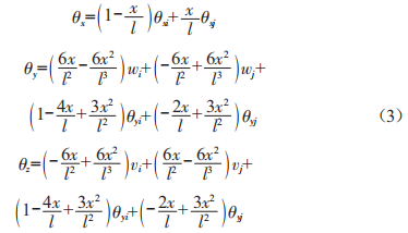 梁單元與桿單元相比,除了均有3個方向的線位移自由度外,還增加了3個方向的角位移自由度,由于有角位移的存在,因此產(chǎn)生了端部3個方向的彎矩,引起了端部彎矩效應(yīng)。梁單元角位移函數(shù)具體如下: