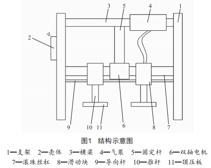 如圖1所示,本設(shè)計(jì)包括兩根平行設(shè)置的支架,兩個(gè)支架之間設(shè)有一根橫梁,橫梁上設(shè)有一個(gè)氣泵,且連接有一根固定桿,固定桿的端部設(shè)有一個(gè)雙軸電機(jī),雙軸電機(jī)的兩端均連接有滾珠絲杠,每根絲杠螺母上均設(shè)有一個(gè)滑動塊,每個(gè)滑動塊上安裝有一個(gè)單出桿活塞缸,其中一個(gè)支架上設(shè)有殼體,殼體的內(nèi)部設(shè)有蓄電池。該氣動式夾裝機(jī)械手調(diào)控頂板器中,通過雙軸電機(jī)來控制兩塊頂壓板的位置,同時(shí)配合兩個(gè)汽缸同步工作,可以對不同體積的砌塊進(jìn)行推送,從而提高了裝置的實(shí)用性。當(dāng)需要對不同體積的砌塊進(jìn)行推送的時(shí)候,首先控制雙軸電機(jī)6工作,隨后雙軸電機(jī)6就會控制兩端的絲杠7轉(zhuǎn)動,配合導(dǎo)向桿9的作用,使得兩個(gè)滑動塊8帶動汽缸相對運(yùn)動,接著兩個(gè)汽缸同步工作,推桿10則能夠?qū)Σ煌w積的砌塊進(jìn)行推送。