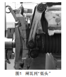 正常情況下,在制動緩解時,閘瓦托可以繞著其較接點(螺桿套筒)旋轉,以適應在不同制動位置時閘瓦與車輪踏面的貼合度。在實際運行中發(fā)現(xiàn),閘瓦托不能繞較接點轉動,閘瓦托角度明顯與車輪踏面不匹配,即產生閘瓦托上端間隙小、下端間隙大的"低頭"現(xiàn)象,如圖1所示。