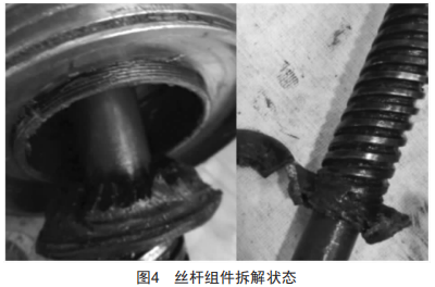 閘瓦間隙手動調整功能主要是通過圖3的絲桿組件實現(xiàn),將故障件的絲桿組件拆解,發(fā)現(xiàn)緊定螺釘及絲桿齒座均已斷裂,絲桿齒座從調節(jié)螺母的內螺紋中旋出8mm,螺紋處未見螺紋膠,如圖4所示。該距離已遠大于端面齒嚙合高度,致使端面齒脫離,所以手動調整時沒有端面齒的嚙合聲。因緊定螺釘及絲桿齒座均已斷裂,手動調整轉動調節(jié)螺母時,作用力并不能傳遞至絲桿,此時只是調節(jié)螺母獨自轉動,而內部的絲桿并未轉動,所以不能帶動閘瓦托貼近或遠離車輪踏面,閘瓦間隙手動調整功能失效。