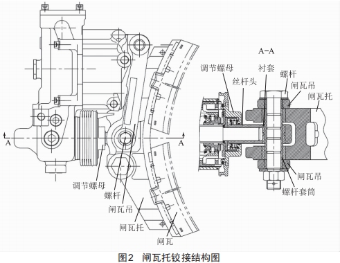 如圖2所示,閘瓦托與絲桿頭中間開孔,穿入螺桿套筒連接,閘瓦吊左右共設置兩個叉臂,叉臂中間設孔,叉臂插入閘瓦托兩側端面對準孔后,螺桿依次穿過閘瓦吊一側叉臂孔、螺桿套筒內孔、閘瓦吊另一側叉臂孔,完成三者較接。閘瓦托內孔大于螺桿套筒外徑,二者間隙配合,閘瓦托寬度小于螺桿套筒長度,即安裝后螺桿套筒伸出閘瓦托左右端面,閘瓦吊2叉臂間寬度大于閘瓦托寬度。以上設計使得閘瓦吊2叉臂內側實際上是與螺桿套筒左右端面頂住壓緊,閘瓦托旋轉自由度未受限,閘瓦托可繞著較接點(螺桿套筒)自由轉動,使得閘瓦角度始終與車輪踏面匹配,閘瓦能均勻磨耗,延長使用壽命。