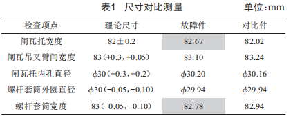 結合章節(jié)2所述,影響閘瓦托轉動靈活度的因素主要集中在閘瓦托、閘瓦吊、絲桿頭這三者形成的較接結構處,各零件的理論尺寸及空間位置能滿足閘瓦托的旋轉。為進行對比分析,選取一件閘瓦托轉動良好的產品作為對比件,將故障件與對比件分別拆解,測量較接結構處相關零件的關鍵尺寸要素。相關測量結果如表1所示。