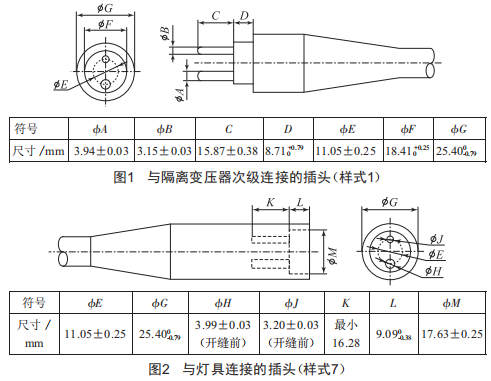 單燈監(jiān)控裝置一端連接隔離變壓器的次級,另一端連接燈具的輸入端。由于隔離變壓器和燈具的連接器均已有標(biāo)準(zhǔn)規(guī)定,因此,單燈監(jiān)控裝置的連接器需要按照標(biāo)準(zhǔn)化設(shè)計,與隔離變壓器次級連接的插頭應(yīng)滿足圖1(樣式1)的要求,與燈具連接的插座應(yīng)滿足圖2(樣式4)或圖3(樣式8)的要求。