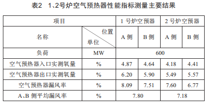 600MW穩(wěn)定負荷工況下,分別測試兩臺鍋爐空氣預(yù)熱器進、出口煙氣成分,計算空氣預(yù)熱器漏風率,主要結(jié)果如表2所示。