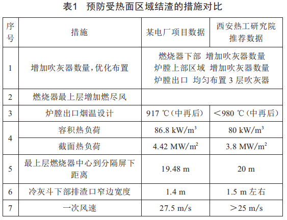 鍋爐結(jié)焦有90%以上是由于煤質(zhì)變化引起的,因此為預(yù)防受熱面結(jié)渣,可考慮適當(dāng)摻燒不同的煤種,或者采用優(yōu)化的結(jié)渣預(yù)防措施。表1為西安熱工研究院推薦的預(yù)防鍋爐受熱面結(jié)渣的相關(guān)措施以及某電廠的實(shí)際執(zhí)行情況,實(shí)踐表明,采用優(yōu)化的結(jié)渣預(yù)防措施,結(jié)渣情況得到了明顯改善。