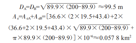 由于建筑物中間有個(gè)空中花園,導(dǎo)致整幢建筑高度不一,現(xiàn)將建筑南北兩棟樓分別標(biāo)稱為A樓、B樓,中間連接部分標(biāo)為C,但其擴(kuò)大寬度遠(yuǎn)小于A、B兩樓的擴(kuò)大寬度,故其等效面積已經(jīng)涵蓋在A、B兩樓的等效覆蓋面積內(nèi)。因此,恒豐國際廣場大樓的等效面積為A、B兩樓疊加后的等效面積。