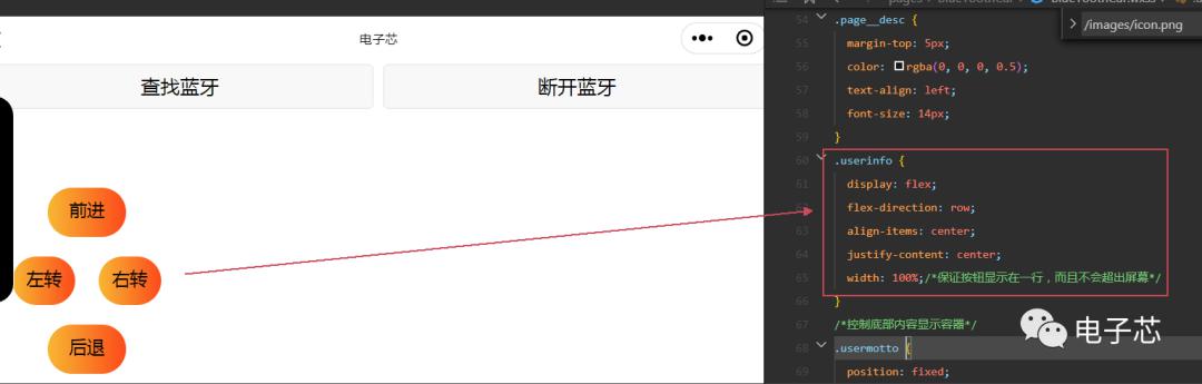 接下來是對(duì)左轉(zhuǎn)和右轉(zhuǎn)按鈕的同行控制。通過userinfo來實(shí)現(xiàn)樣式的控制,將兩個(gè)按鈕放在同一個(gè)div下即可。通過測(cè)試發(fā)現(xiàn)這個(gè)方法多個(gè)按鈕都可以控制在同一行,所以使用同一行控制就可以應(yīng)用此渲染方法。