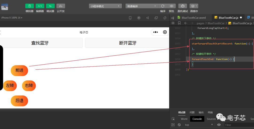 接下來需要完成按鈕的事件操作,本來想用按鈕長(zhǎng)按才進(jìn)行數(shù)據(jù)發(fā)送,但是長(zhǎng)按的識(shí)別事件并不會(huì)一直觸發(fā)這個(gè)事件,在一次長(zhǎng)按操作下只會(huì)觸發(fā)一次,所以并不能一直觸發(fā)進(jìn)行發(fā)送數(shù)據(jù)。因此使用了按鈕按下和按鈕松開事件觸發(fā)操作。在按鈕按下后置位一個(gè)標(biāo)志位,進(jìn)行數(shù)據(jù)發(fā)送,這個(gè)數(shù)據(jù)需要一直發(fā),讓小車一直進(jìn)行行駛。只有松開按鈕后才會(huì)停止。下圖是針對(duì)前進(jìn)按鈕的按下和松開的時(shí)間操作函數(shù)。