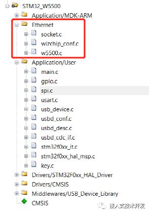 我們只需將W5500文件夾下的.c文件以及socket.c和wizchip_conf.c文件添加到工程中即可。如下: