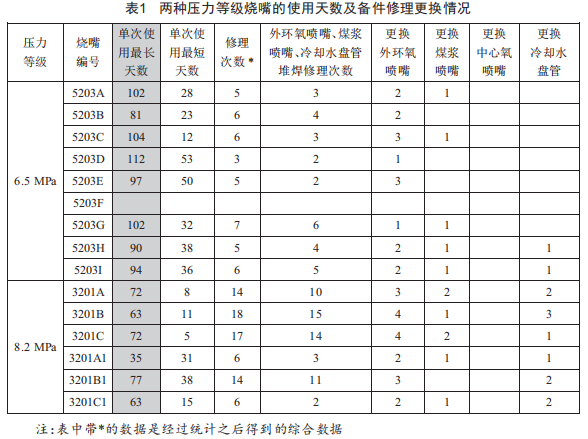 為便于研究,下面以中石化南京化學(xué)工業(yè)有限公司煤化工部兩套裝置的兩種壓力等級(分別為6.5MPa和8.2MPa)水煤漿氣化爐工藝燒嘴為對象,分析其2006年以來最長的使用天數(shù)及備件修理更換情況,具體如表1所示。