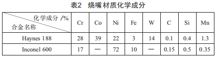 由于氣化爐工藝燒嘴的運行環(huán)境較為特殊,所以燒嘴外氧、煤漿、中心氧管選用1neone1600合金,這是一種鎳-鉻-鐵基固溶強化合金,其具有良好的耐高溫腐蝕和抗氧化性能。而燒嘴的頭部采用的則是Haynes188,這種材質(zhì)具備良好的高溫耐磨性能,由此能夠使燒嘴煤漿環(huán)隙的磨損程度大幅度降低,有助于延長其使用壽命。燒嘴材質(zhì)化學(xué)成分如表2所示。如果氣化爐工藝燒嘴及其頭部采用的不是上述材質(zhì),那么在高溫條件下,燒嘴的使用壽命必定會相應(yīng)縮短。