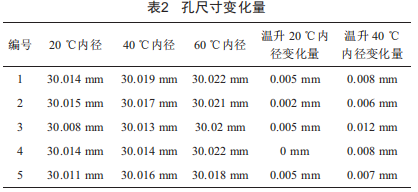 對(duì)5只小30的大齒輪孔在20c、40c和60c溫度下小30內(nèi)徑尺寸進(jìn)行測(cè)量,結(jié)果如表2所示。
