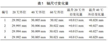 試驗(yàn)中,小30的軸從20℃升高到40℃時(shí),尺寸變化量平均為0.013mm:從20℃升高到60℃時(shí),尺寸變化量平均為0.028mm。與理論軸膨脹量相符。